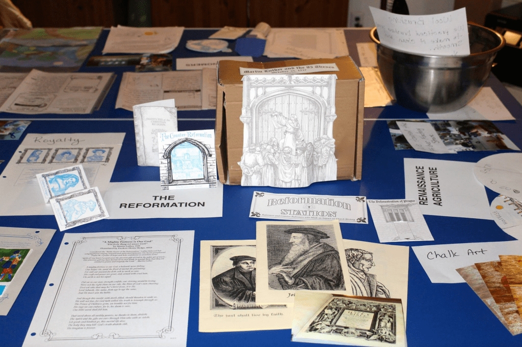 We displayed many of the hands-on, interactive projects we created over the past year, including information about dissections, reformers, inventors, music, royalty, timeline figures, and so much more. Most of these hands-on projects came directly from Raiders of the Renaissance Minds: An EPIC Adventure and Project Passport: The Renaissance and Reformation. These unit study project books make it easy to pull together a year-long curriculum and host a celebration at the end of the year.